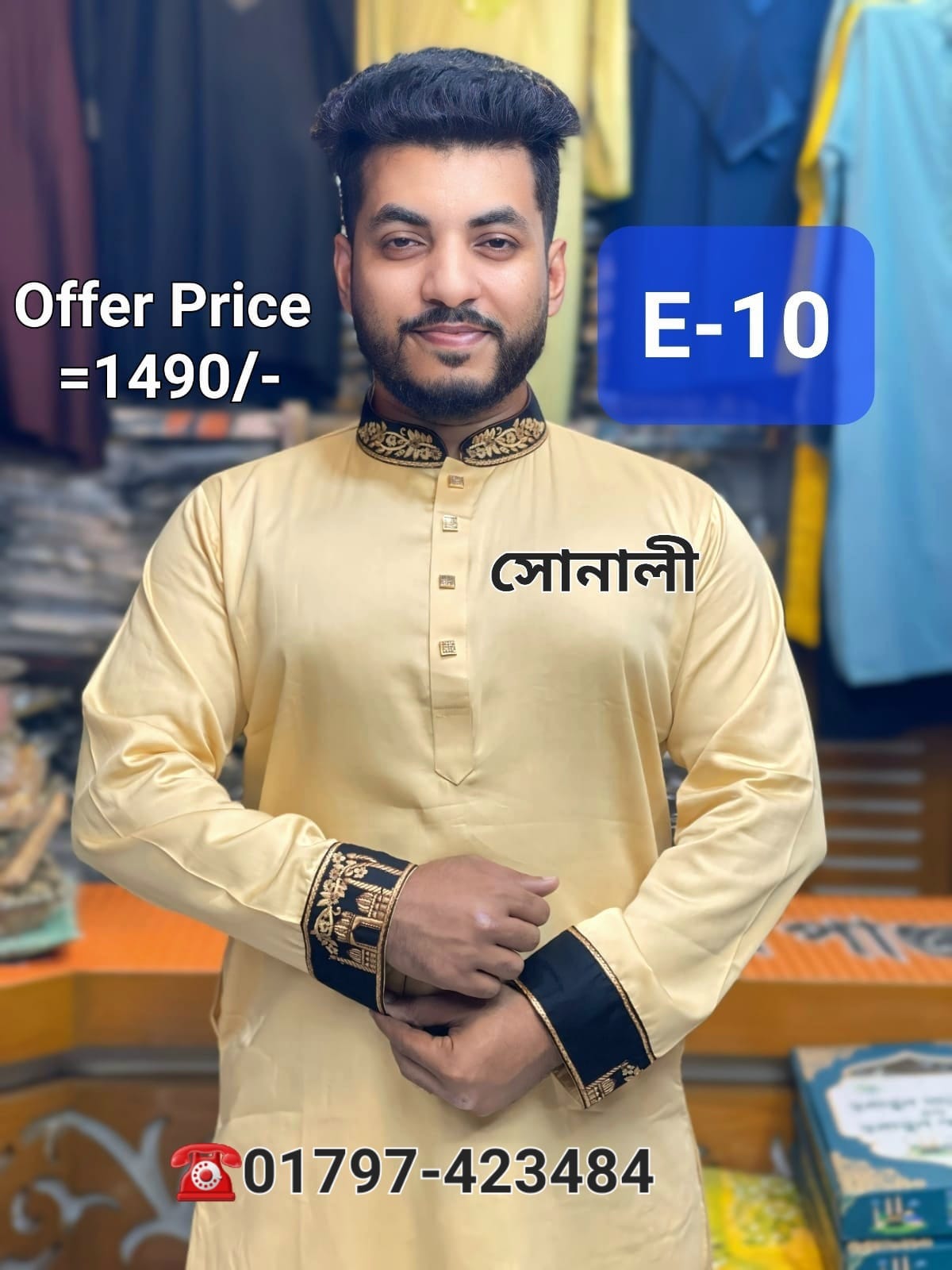 হাতা কলার এমব্রয়ডারি পাঞ্জাবী= E-10 (সোনালী)